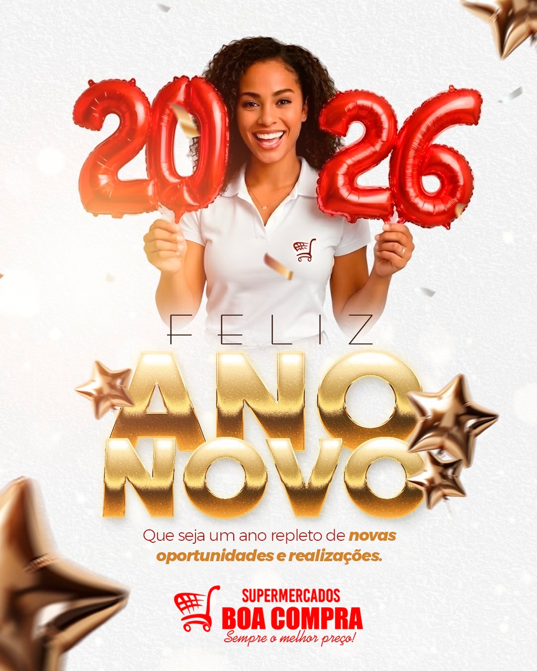 Que 2026 venha cheio de esperança e novos sonhos! Que cada conquista brilhe, que novos caminhos se abram e que a prosperidade esteja presente em cada lar. No Supermercados Boa Compra, seguimos juntos, oferecendo qualidade, economia e momentos especiais ao seu lado. Feliz Ano Novo! Que seja um ano de realizações, oportunidades e muita alegria!